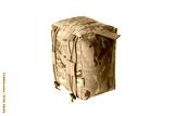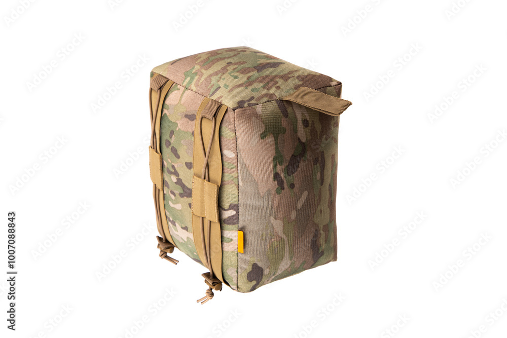 A tactical barricade bag in a camouflage pattern. The bag is designed to provide stability for firearms when shooting from barricades or uneven surfaces.Isolate on white back.