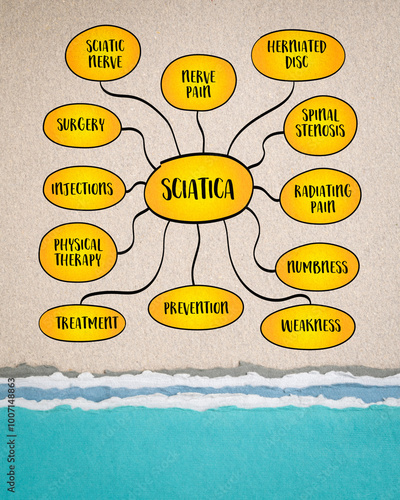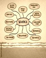 Sciatica refers to pain that radiates along the path of the sciatic nerve, the largest nerve in the body, mind map infographics.