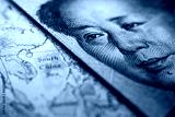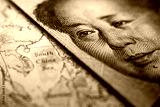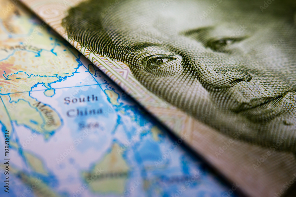 Close-up of Mao Zedong on a 1 yuan Chinese banknote on top of a map showing the South China Sea