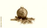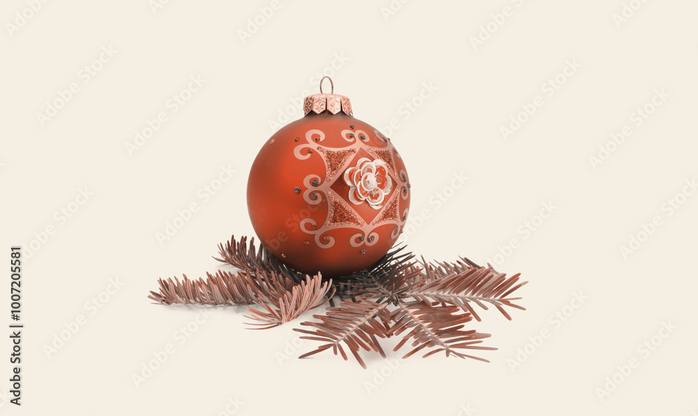Red, orange, brown Christmas balls and spruce branch, snow on neutral beige uniform vintage background.