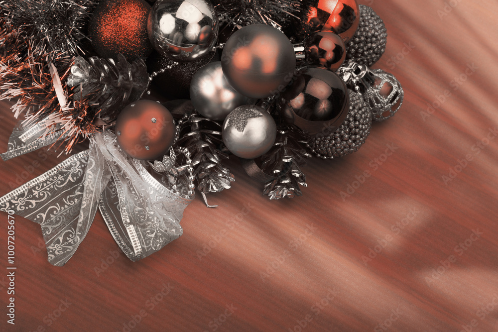 Christmas glow shine glitter decoration balls on brown beige copy space background.