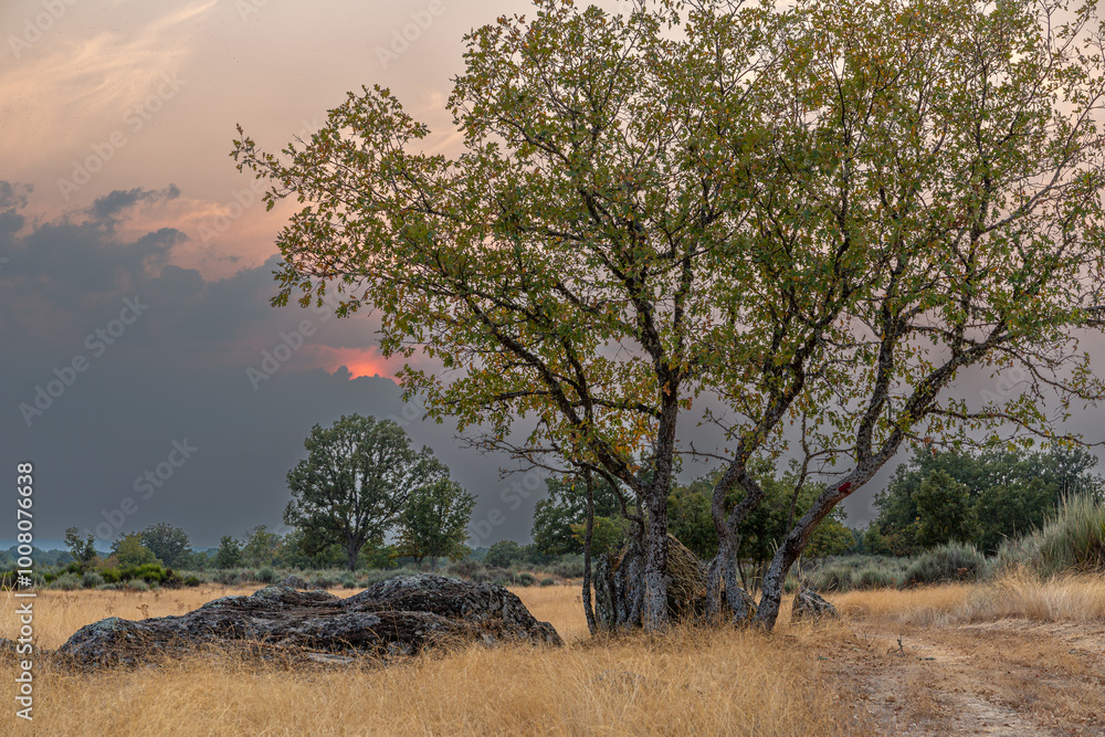 Sunset landscape with meadow, rocks, oak trees and sky with clouds. Valparaiso, Zamora, Castile and Leon, Spain.