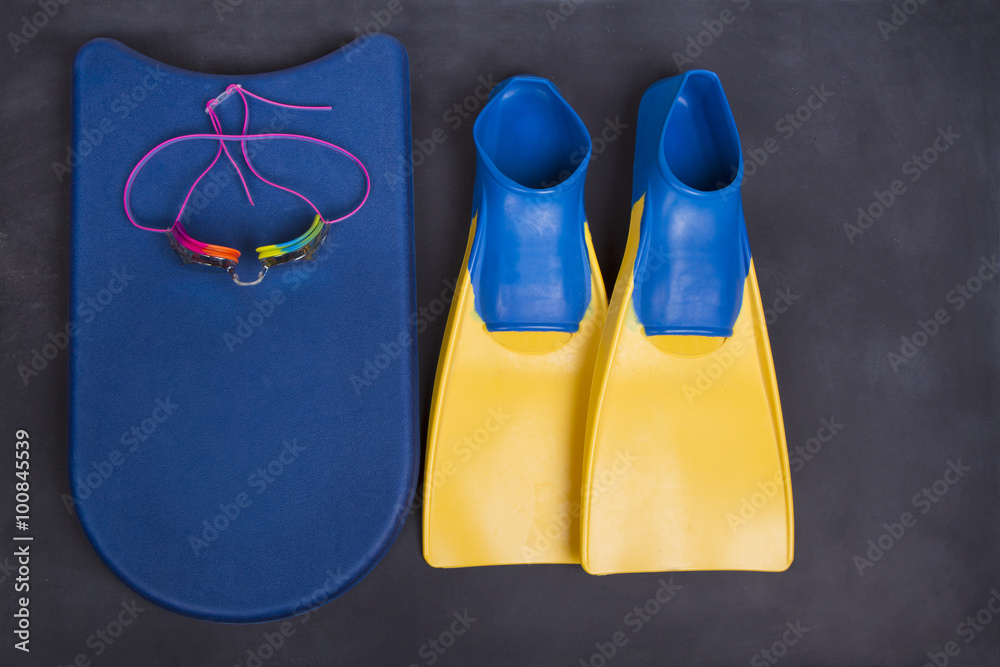 Swim team equiptment on a blackboard or chalkboard