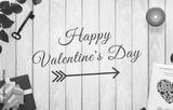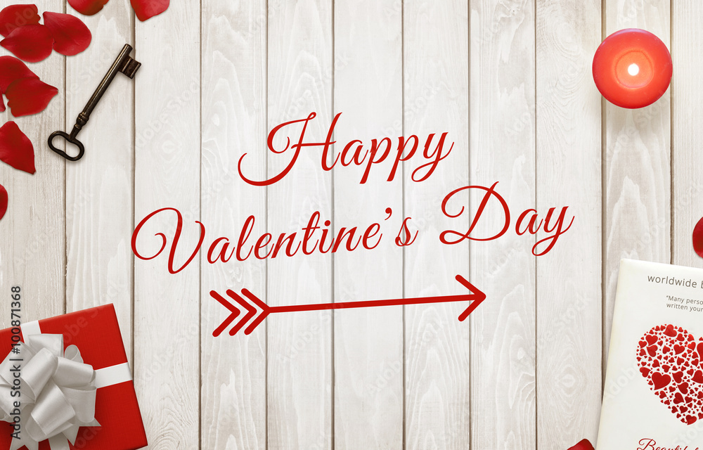 Valentines day romantic background with gift, candle, book, petals, key on wooden table.