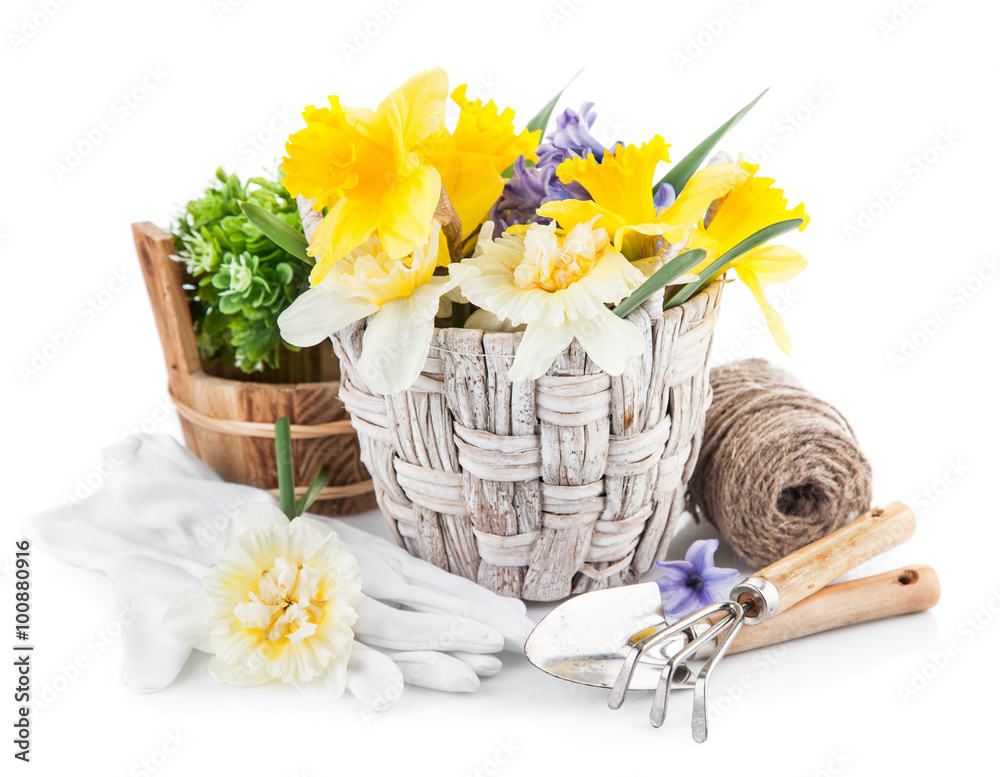 Spring flowers in basket with garden tools. Isolated on white