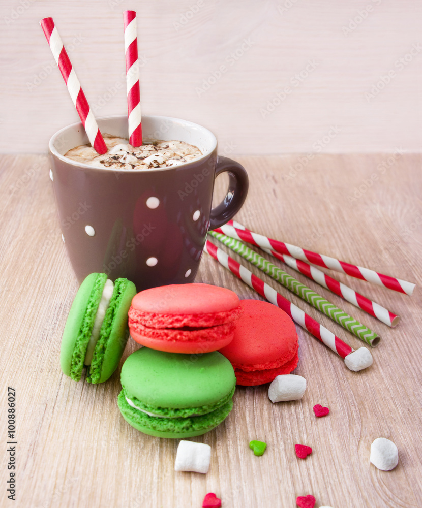 Hot chocolate with marshmallow and macarons for valentine's day