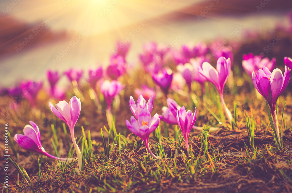 Blooming spring flowers crocus as soon as snow descends in sunlight.