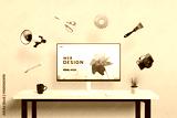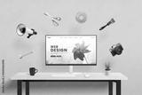 Web design concept page displayed on computer in studio, surrounded by creative, marketing, and office tools flying around. Concept of the creative process in a modern design studio environment