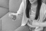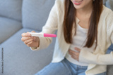 Happy thankful asian young woman hand holding pregnancy test after result with positive, surprised glad girl sitting on couch living room at home. Pregnant of ovulation fertility, motherhood concept.