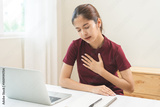 Heart attack, health care concept, suffering acute cardiac asian young woman hand touching on her chest pain, breathing problem, asthma attack, pressure while sit work with computer, laptop at home.