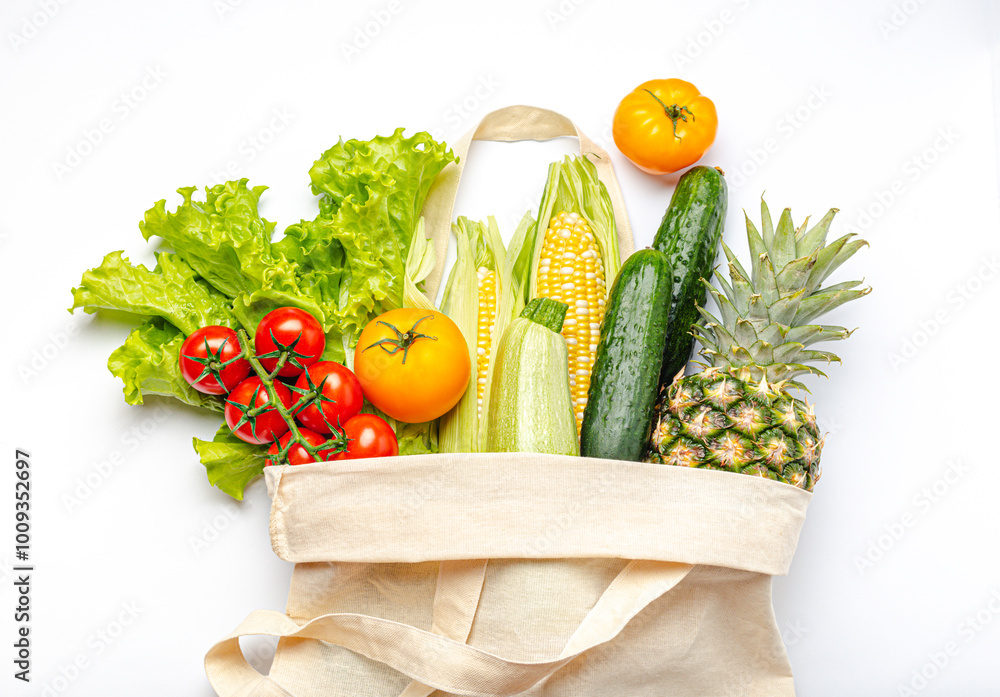 Grocery shopping. Different fresh fruit and vegetables in a textile shopper bag on white background, healthy food from supermarket or delivery concept..