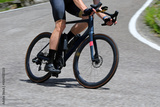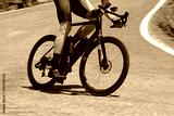 cyclist is pedaling downhill on a smooth asphalt road during a challenging mountain bike competition
