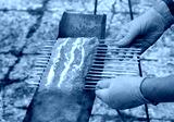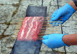 cook with blue latex gloves cooking many skewers with mutton and lamb called ARROSTICINI a typical dish of Italian cuisine in the regions like Abruzzo and Molise