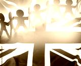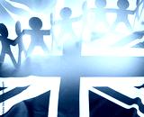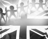 Team of paper chain people united together on British Union Jack flag