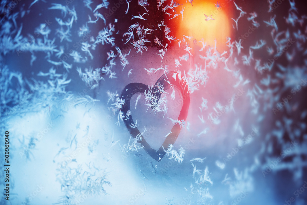 Closeup image of heart symbol written on frozen frost window
