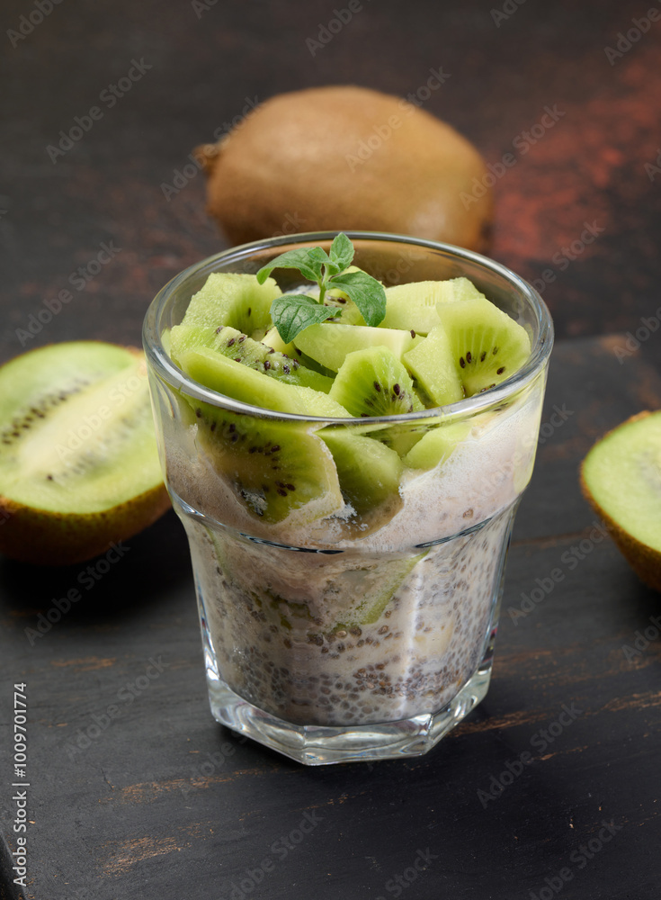 Glass with chia seeds and yogurt with kiwi pieces on table