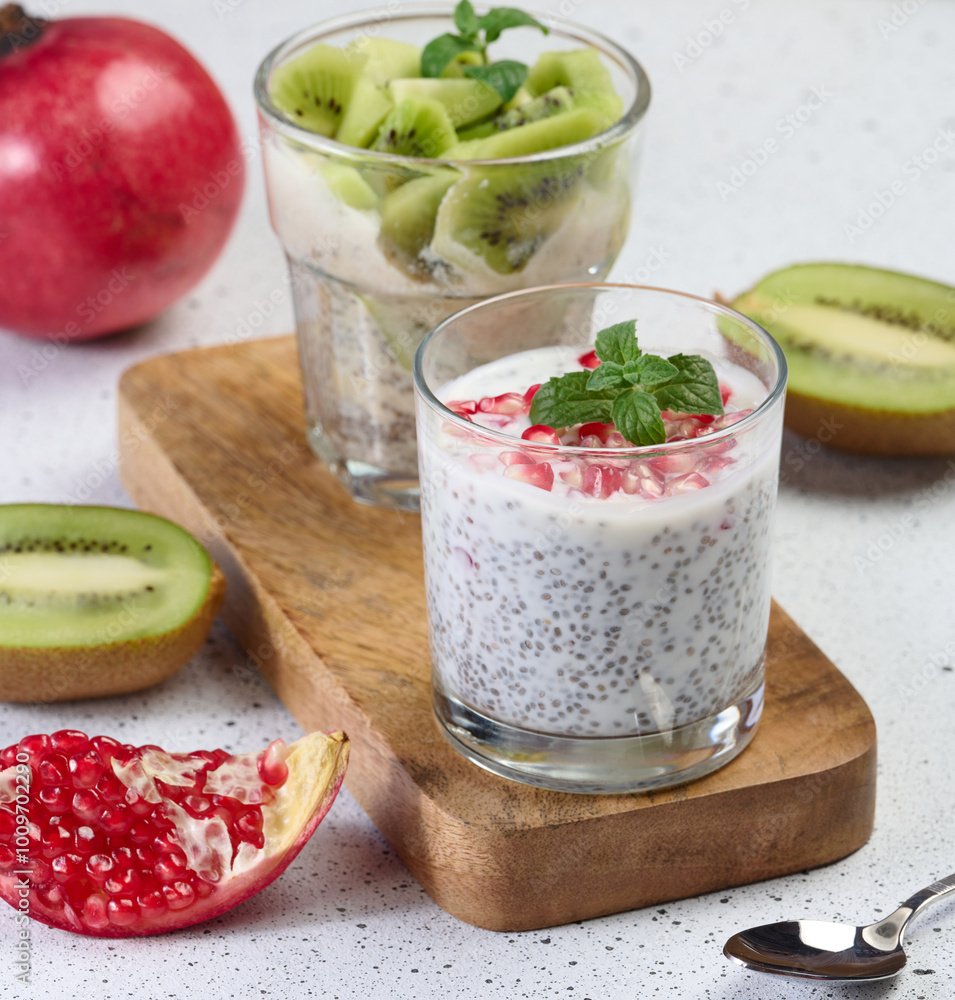 Two glasses of chia yogurt dessert garnished with fresh fruit, pomegranate seeds and kiwi slices