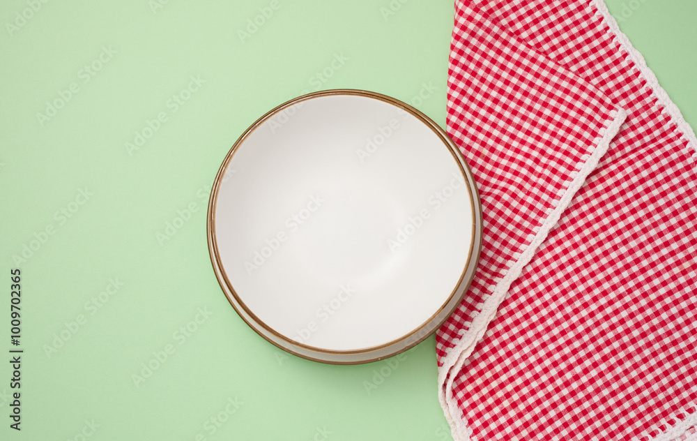 Round ceramic empty white plate and red kitchen towel on green background, top view