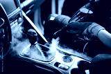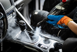 Steam cleaning a car interior to remove dirt and grime in a detailed auto detailing session