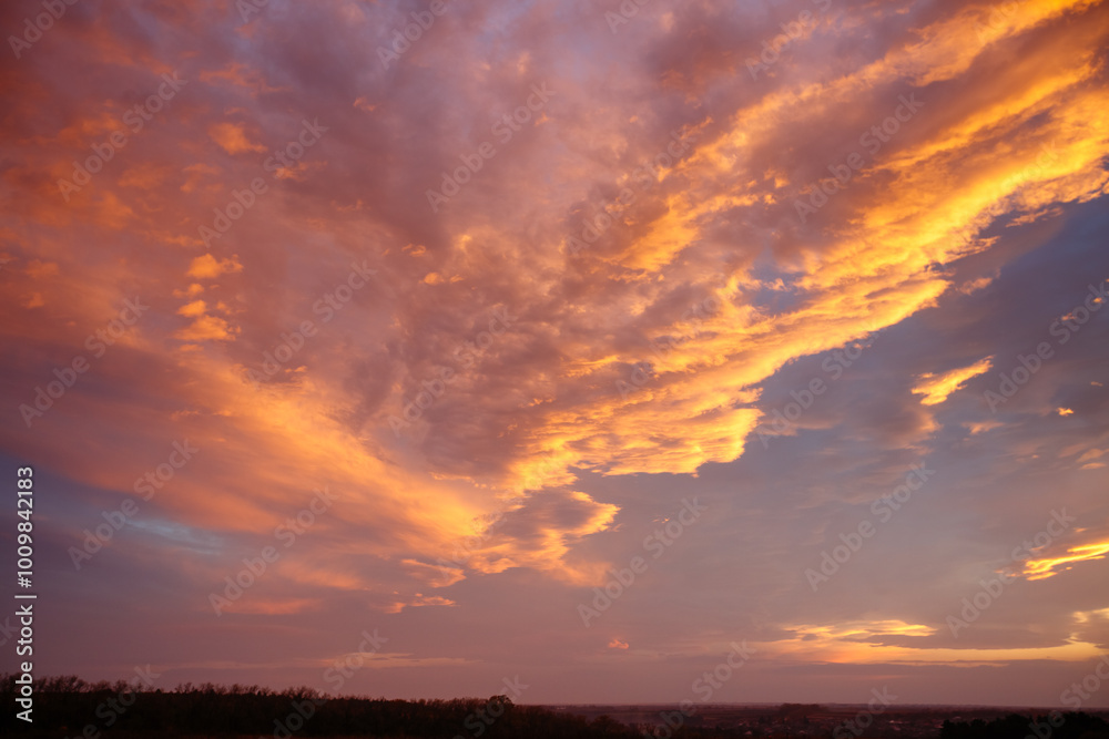 Fabulous and spectacular vivid clouds illuminated by the rays of the sun at sunset.