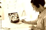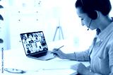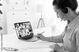 Video call with team.Side view of caucasian business woman having online meeting with her multiracial colleagues, talking about project plan and strategy via video conference, share ideas, takes notes