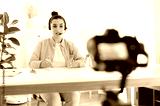 Confident pretty indian or arabian brunette young woman, blogger, influencer sits at a desk, looking at camera, recording education tutorial vlog, video course for social media