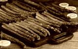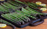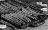 Fresh asparagus on cast iron table for frying