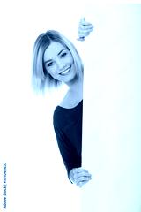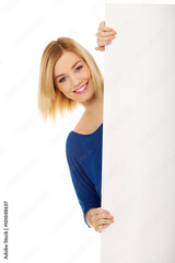 Happy young woman with blank billboard