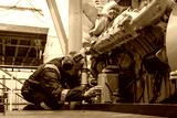 Marine Engineer in blue overall working in Engine room of ship. Work at sea. Motorman.