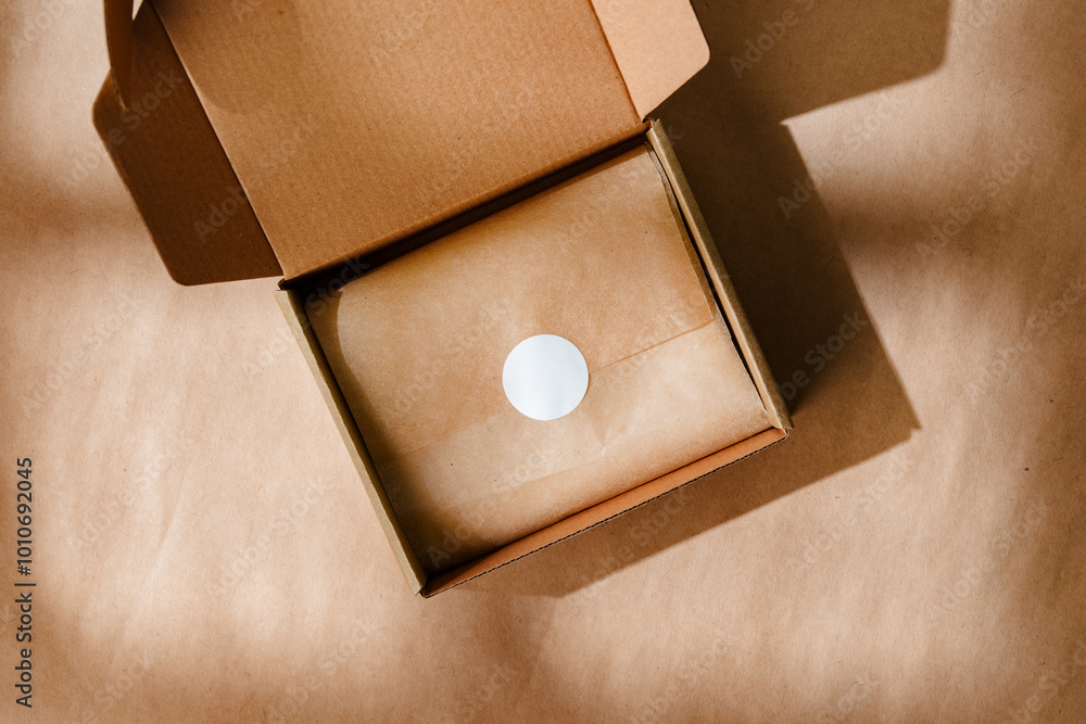 A sealed kraft box containing a wrapped item, positioned on a textured brown surface for an unboxing experience