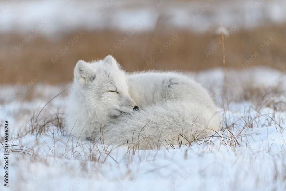 Wild arctic fox in tundra. Arctic fox lying. Sleeping in tundra.
