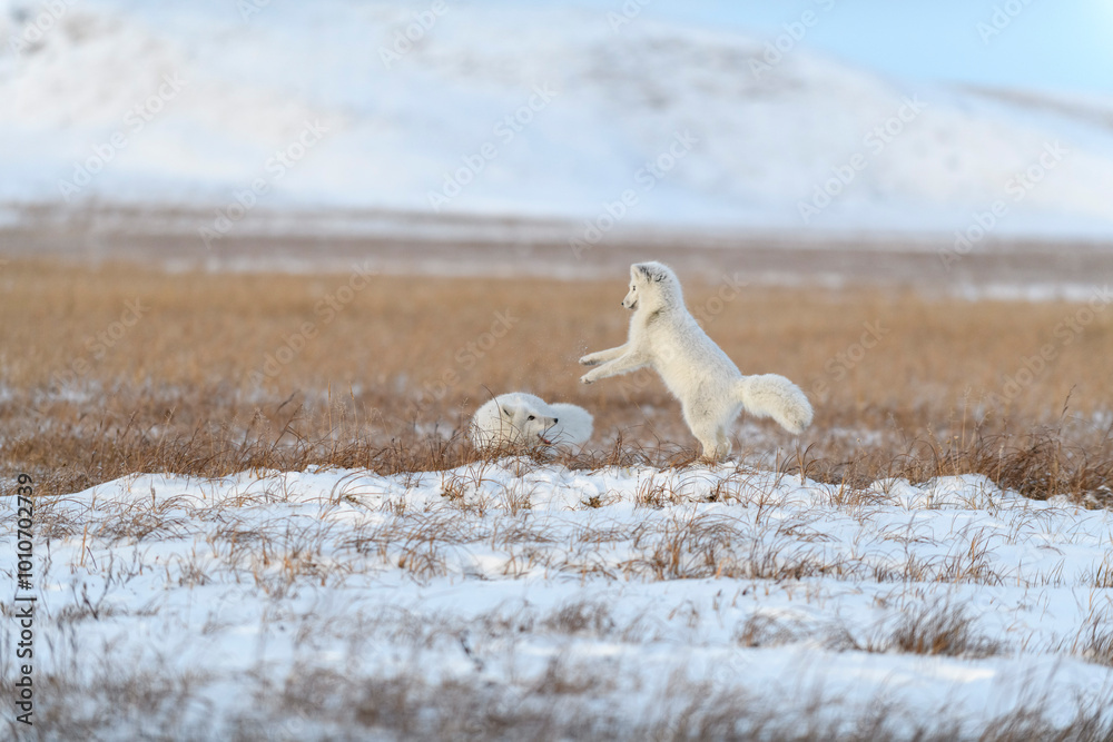 Two young arctic foxes (Vulpes Lagopus) in wilde tundra. Arctic fox playing.