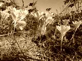 Yellow flowers of crocus or sternbergia bloom in dry grass against blue sky in autumn.