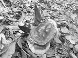 Mushroom red-brown Lacquered bracket or Ganoderma lucidum lies on the ground in brown leaves.