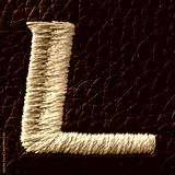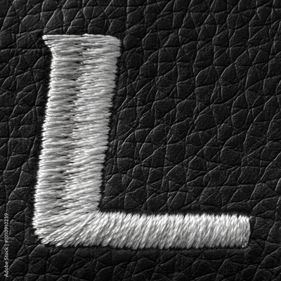 Letter L embroidered with white threads on black leather. English alphabet. Element for design.