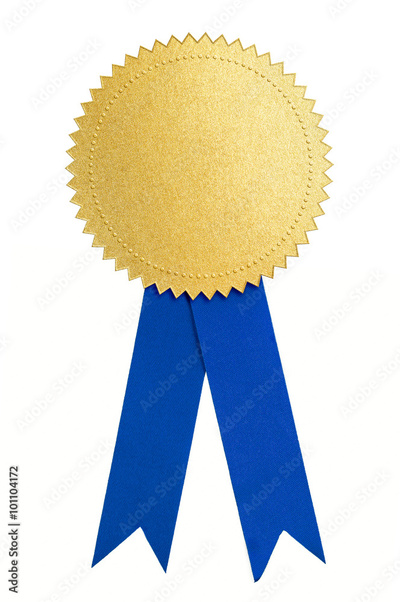 Gold seal or medal and blue ribbon isolated