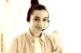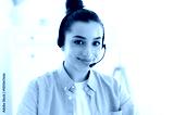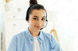 Close-up photo of an attractive successful brunette caucasian woman in a blue shirt with headset, working as call center operator, customer support service, hotline assistant, smile at camera friendly