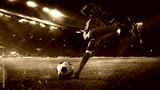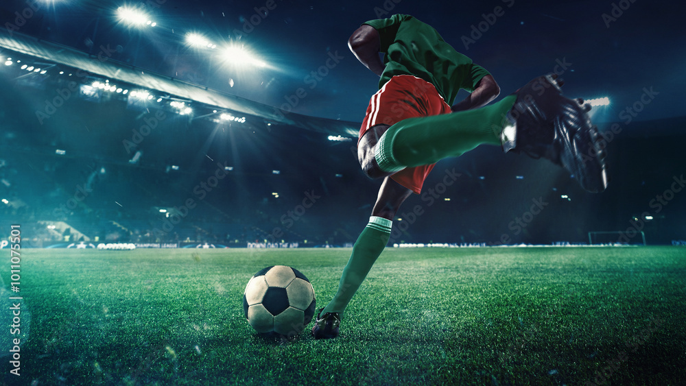 Back view on focused man, soccer player in motion, running on field and controlling ball during match, competing for the victory. 3D render of stadium. Concept of sport, tournament, competition, game