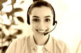 Close-up photo of a positive beautiful successful brunette caucasian woman with headset, working as call center operator, customer support service, hotline assistant, business coach, smiles at camera