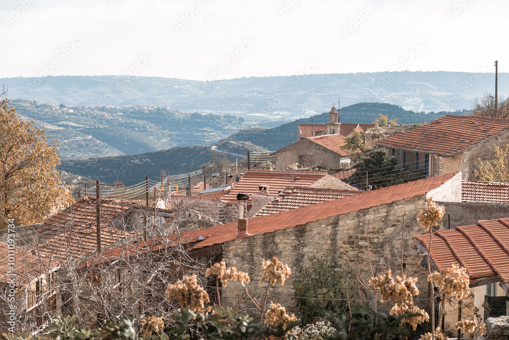 Picturesque stone houses with red tiled roofs covering a hillside overlooking mountains. Vouni, Cyprus