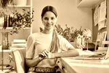 Portrait of smiling female teenager looking at camera, sitting at home at desk with computer