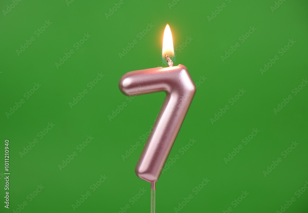 Burning pink birthday candle on green background, number 7