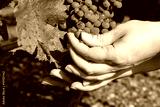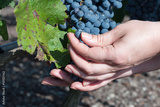 Grapes harvest Hands inspecting the black ripe grape harvest
