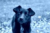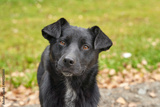 Curious black dog in nature setting with green background and fallen leaves.