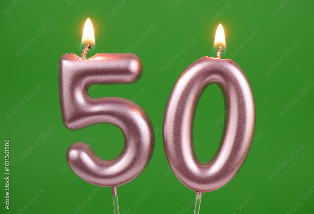 Burning pink birthday candles on green background, number 50