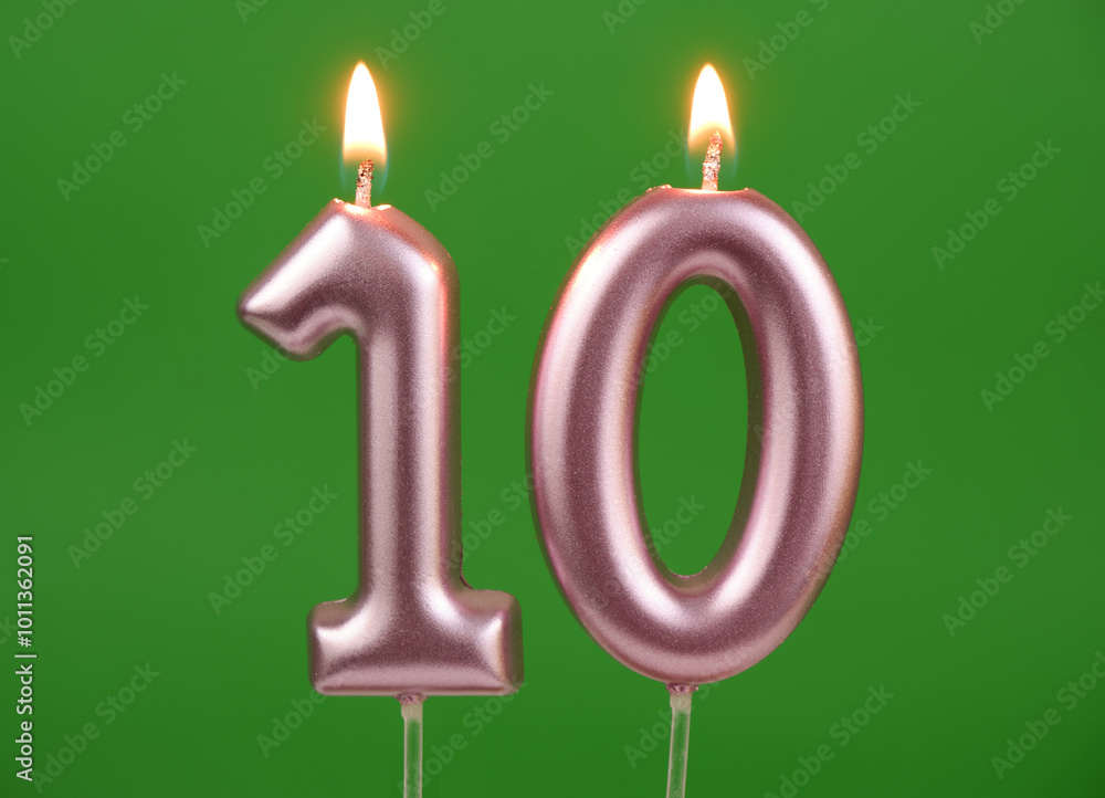 Burning pink birthday candles on green background, number 10