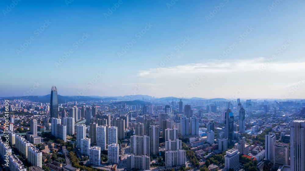 Panoramic Urban Cityscape View with Skyscrapers and Blue Sky