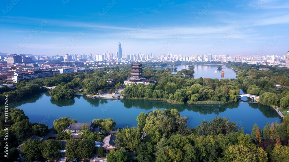 Aerial View of Lush Park Surrounded by Urban Skyline