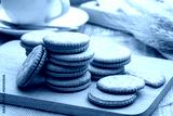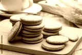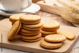 Sandwich crackers filled with peanut butter flavored cream on wooden plate