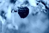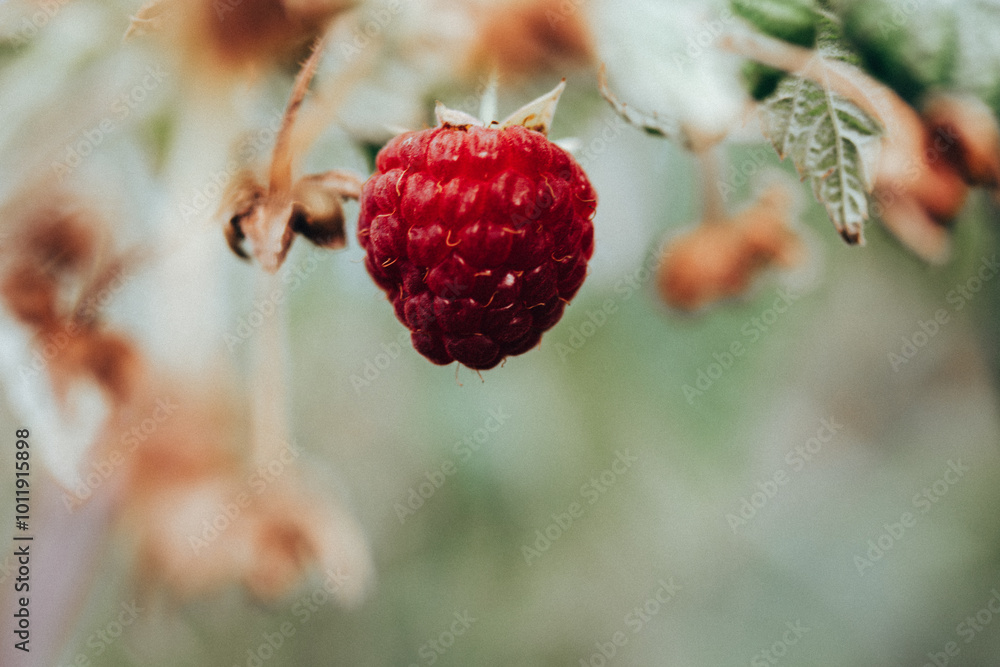 A ripe raspberry on the branch of a raspberry bush in the garden, farm land. Summer harvest in the countryside. Natural berry on a green background.